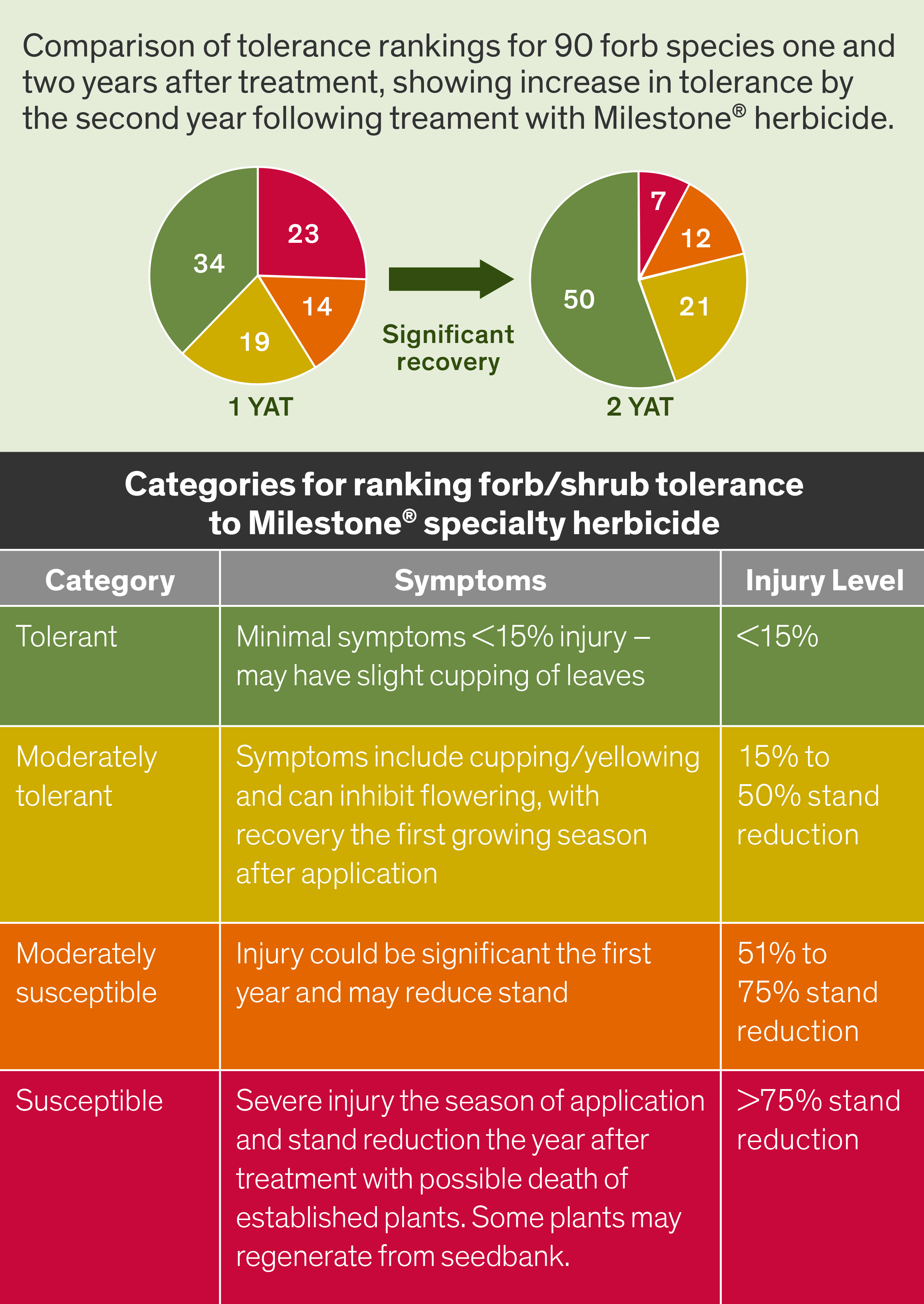 Studies showed that Milestone, when applied at the labeled rate of 5 to 7 fluid ounces per acre, exhibited excellent selectivity toward 90 native forb species and 19 desirable shrubs. Forbs saw an especially good response the second year after treatment, when 79 percent were classified as either “tolerant” or “moderately tolerant.” Of the 19 shrub species present, 74 percent were ranked either “tolerant” or “moderately tolerant” one year after treatment with Milestone® specialty herbicide.