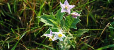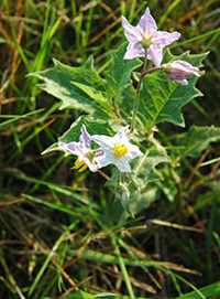 About: Carolina and western horsenettle have erect stems, loosely branched and covered with gray hairs, and yellow spines. The weeds grow to 2 feet tall. Leaves are dark green, oval, pointed at tip, and sharply lobed or wavy-toothed. Clusters of white to purple flowers look like tomato flowers. Bloom is May to October when yellow-orange berries form. Berries are poisonous.