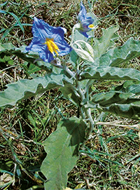 About: Silverleaf nightshade has foliage with a gray or silvery appearance with violet, light blue or white flowers and is 1 to 3 feet tall. Stems are sparsely covered with short, yellow thorns. Leaves and stems have a dense silvery covering of hair.