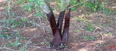 The herbicide solution — herbicide and an oil-based carrier — is applied to the bark, not the leaves. You’re not dependent on foliage. The solution penetrates the bark, and most woody plants will move it to the roots. Result: dead brush. (If you do spray green leaves with the oil-based basal solution, the leaves burn and drop too quickly to move the herbicide. Save your money and basal-spray the bark only.)