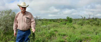 Killam Duval County Ranch manager David Kitner shows off unharmed guayacan, an excellent browse plant, in a pasture sprayed for mesquite control. Mesquite spraying improved the habitat, Kitner says.