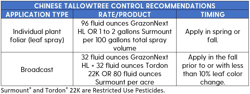Also known as the “popcorn tree,” because its white seeds resemble popcorn, Chinese tallowtree is highly invasive and adaptable. Control can be tricky, because the tree not only reproduces via seeds but also can grow back from a cut stump or roots left in the ground. Using selective herbicide applications as part of a brush management strategy can improve results.