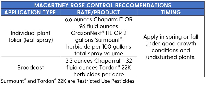 This rose forms dense stands that can severely limit pasture forage production and utilization if left uncontrolled. Controlling Macartney rose requires an effective herbicide program, including follow-up and potential re-treatment. Revisit your land regularly to stay ahead of rose hedge sprouts and plants that are missed or only partially controlled by the initial application.