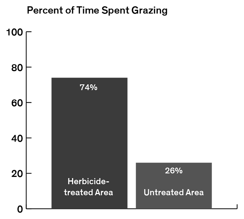 In research conducted by Dr. Kevin Bradley at the University of Missouri, a pasture was split in half, with one side treated with herbicide, the other left untreated. Controlling clover was a big concern during the study — would the cattle be negatively affected by the loss of clover? Four months after treatment, cattle grazed 74 percent of the time on the treated half and only 26 percent on the untreated area.