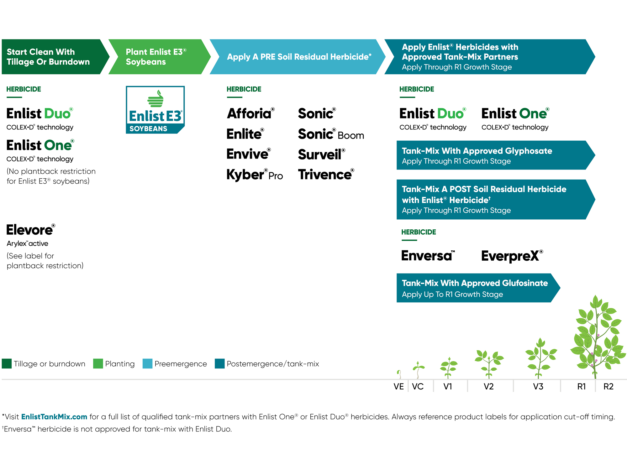 Following burndown, Enlist Duo® and Enlist One® herbicides with Colex-D® technology are the only herbicides containing 2,4-D that are authorized for preemergence and postemergence use with Enlist® crops. Consult Enlist® herbicide labels for weed species controlled. Enlist Duo and Enlist One herbicides are not registered for use or sale in all states and counties; are not registered in AK, CA, CT, HI, ID, MA, ME, MT, NH, NV, OR, RI, UT, VT, WA and WY; and have additional subcounty restrictions in AL, GA, TN and TX, while existing county restrictions still remain in FL. All users must check “Bulletins Live! Two” no earlier than six months before using Enlist One or Enlist Duo. To obtain “Bulletins,” consult epa.gov/espp/, call 1-844-447-3813, or email ESPP@epa.gov. You must use the “Bulletin” valid for the month and state and county in which Enlist One or Enlist Duo are being applied. Contact your state pesticide regulatory agency if you have questions about the registration status of Enlist® herbicides in your area. ALWAYS READ AND FOLLOW PESTICIDE LABEL DIRECTIONS. IT IS A VIOLATION OF FEDERAL AND STATE LAW TO USE ANY PESTICIDE PRODUCT OTHER THAN IN ACCORDANCE WITH ITS LABELING. ONLY USE FORMULATIONS THAT ARE SPECIFICALLY LABELED FOR SUCH USE IN THE STATE OF APPLICATION. USE OF PESTICIDE PRODUCTS, INCLUDING, WITHOUT LIMITATION, 2,4-D-CONTAINING PRODUCTS NOT AUTHORIZED FOR USE WITH ENLIST CROPS, MAY RESULT IN OFF-TARGET DAMAGE TO SENSITIVE CROPS/AREAS AND/OR SUSCEPTIBLE PLANTS, IN ADDITION TO CIVIL AND/OR CRIMINAL PENALTIES. Additional product-specific stewardship requirements for Enlist crops, including the Enlist Product Use Guide, can be found at www.traitstewardship.com.