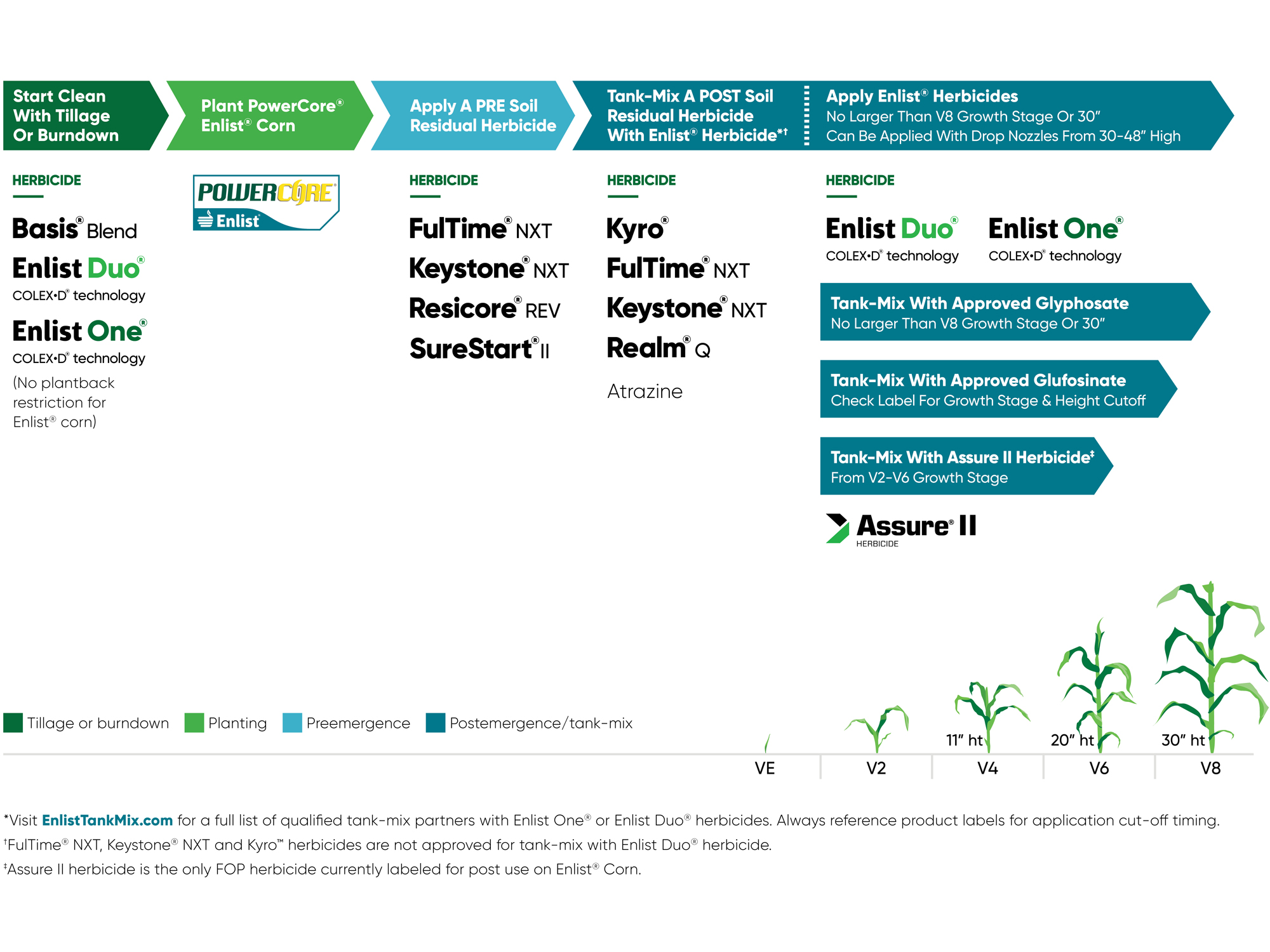 Maximizing the benefits of PowerCore® Enlist® corn is straightforward with a proven, easy-to-follow herbicide program. By integrating advanced trait technology and flexible application options, licensees and their customers can build an effective weed and pest management plan that delivers results all season long.