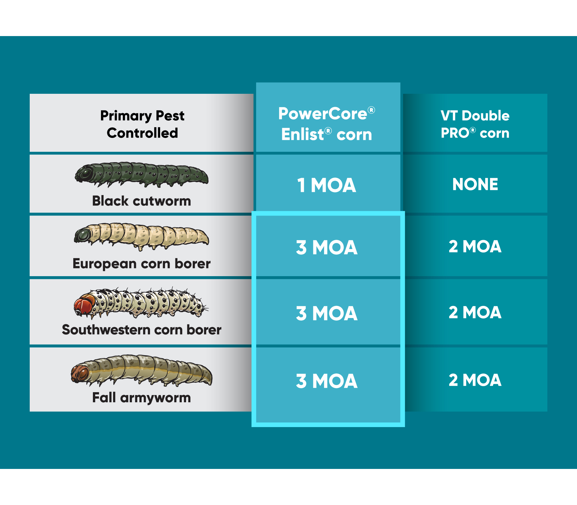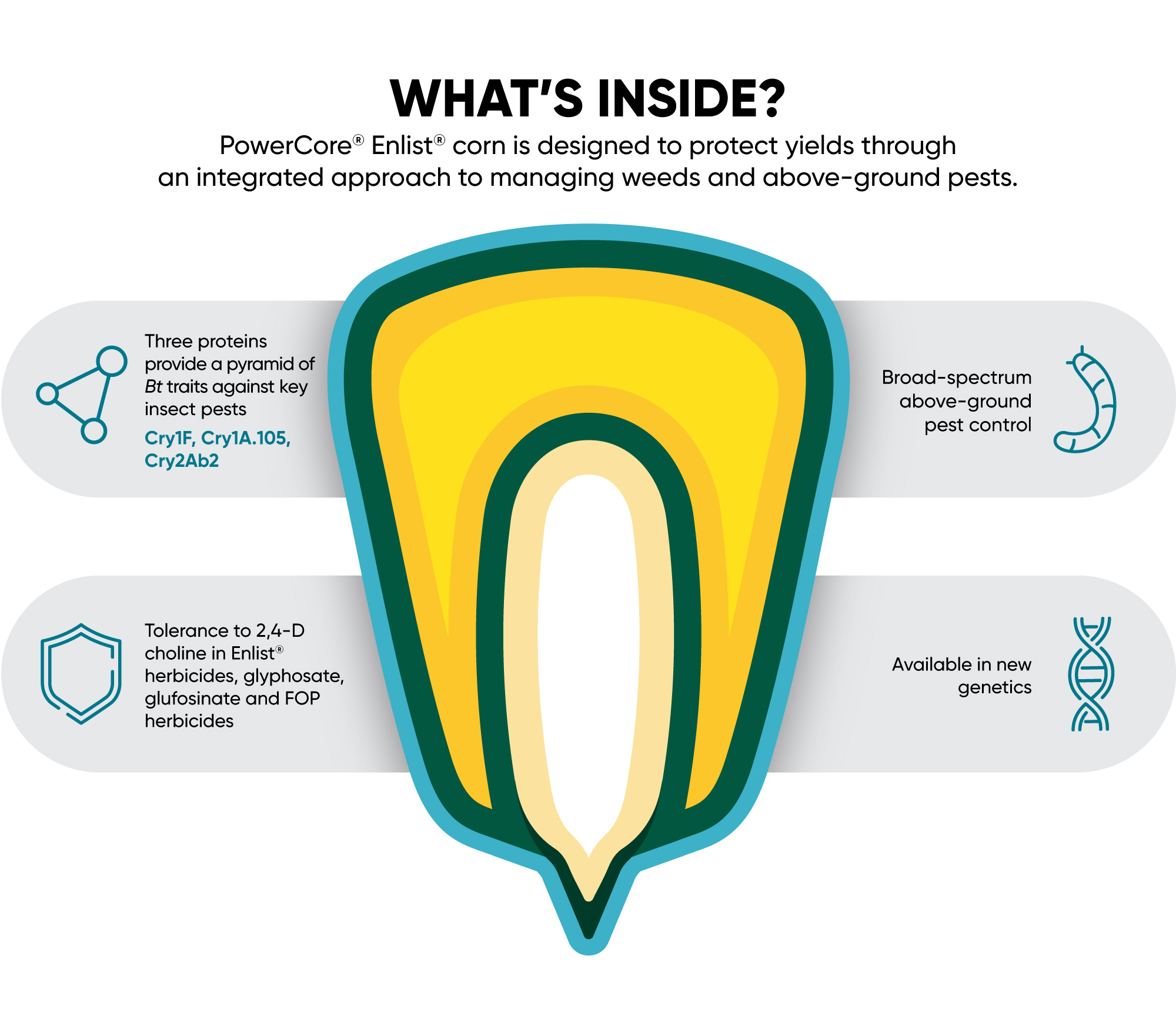 PowerCore® Enlist® corn is a comprehensive trait package for above-ground pests and weed management. PowerCore Enlist corn features three modes of action against above-ground insect pests for broad-spectrum and long-lasting control. Tolerance to multiple herbicides – including glyphosate, glufosinate, 2,4-D choline and FOPS – gives you the flexibility in herbicide choice and management practices to help maximize yield.