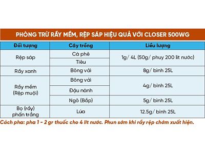 Thuốc trừ sâu Closer® 500WG với công nghệ Isoclast tiên tiến từ Corteva, có cơ chế tác động hoàn toàn mới, đặc trị các côn trùng chích hút (rầy, rệp) kháng thuốc và khó trị trên nhiều loại cây trồng, đặc biệt là Rệp sáp. Hiệu quả nhanh và kéo dài, thời gian cách ly ngắn.