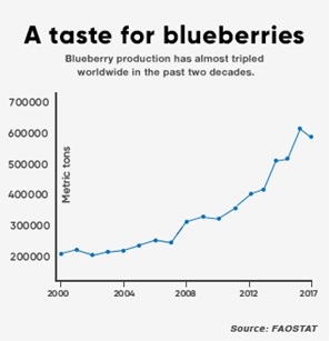 Horticulture—fruits, vegetables, and flowers—turns out to be a significant revenue generator for countries worldwide. In 2017, it accounted for $220 billion of the $1.2 trillion global agriculture trade. And because berries and other fruits account for more than half the value of this segment ($114 billion), countries have stepped up their cultivation and production of these specialty crops for export markets. Worldwide blueberry production alone has grown by nearly a factor of 10 since 2000, from 211,000 metric tons to an estimated 2 million metric tons, thanks to the fruit’s “superfood” status and long shelf life.